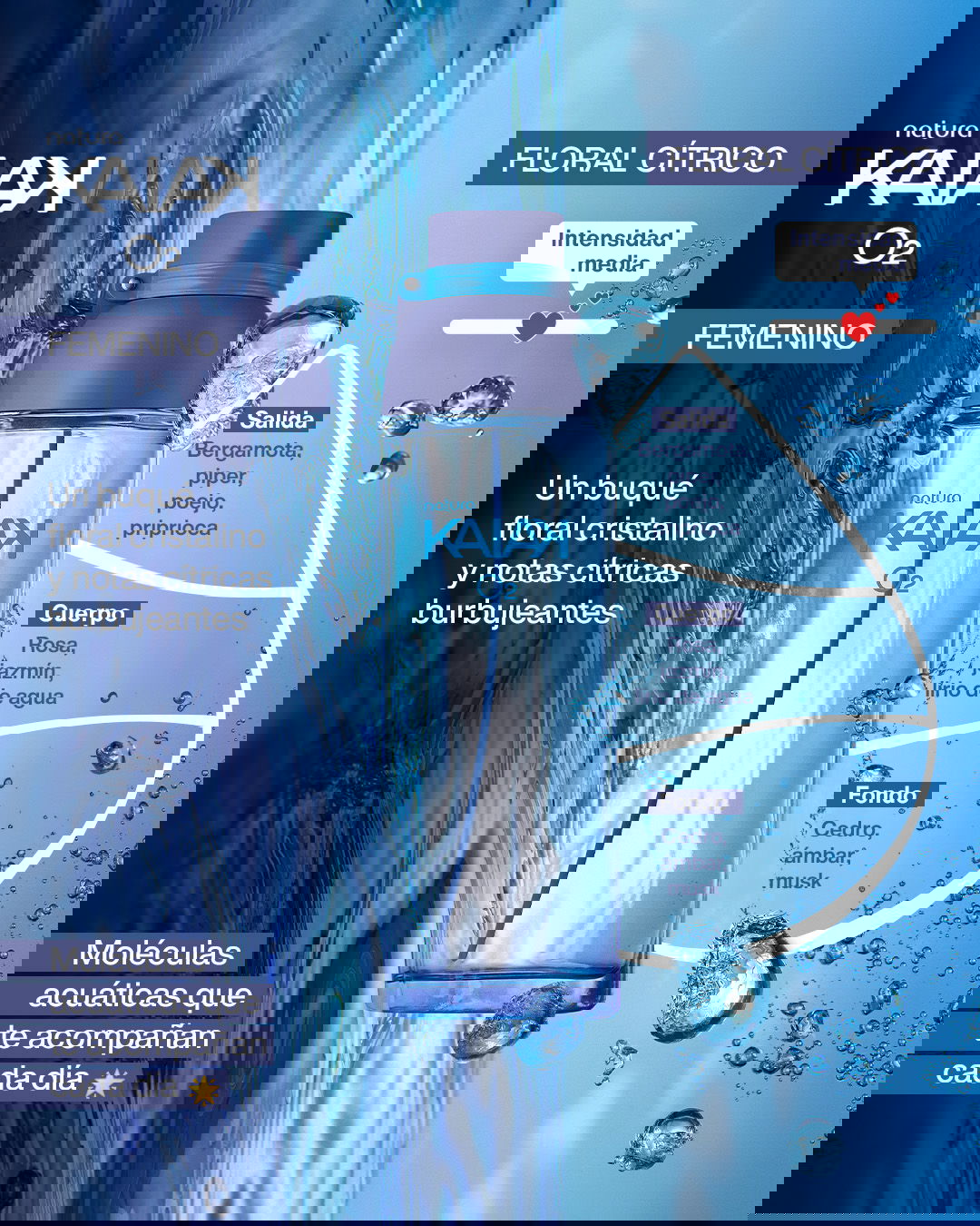 Kaiak 02 para mujer combina notas cítricas chispeantes con un bouquet floral cristalino, realzado por potentes notas acuáticas y el refrescante aroma del poleo, un ingrediente de la biodiversidad brasileña.