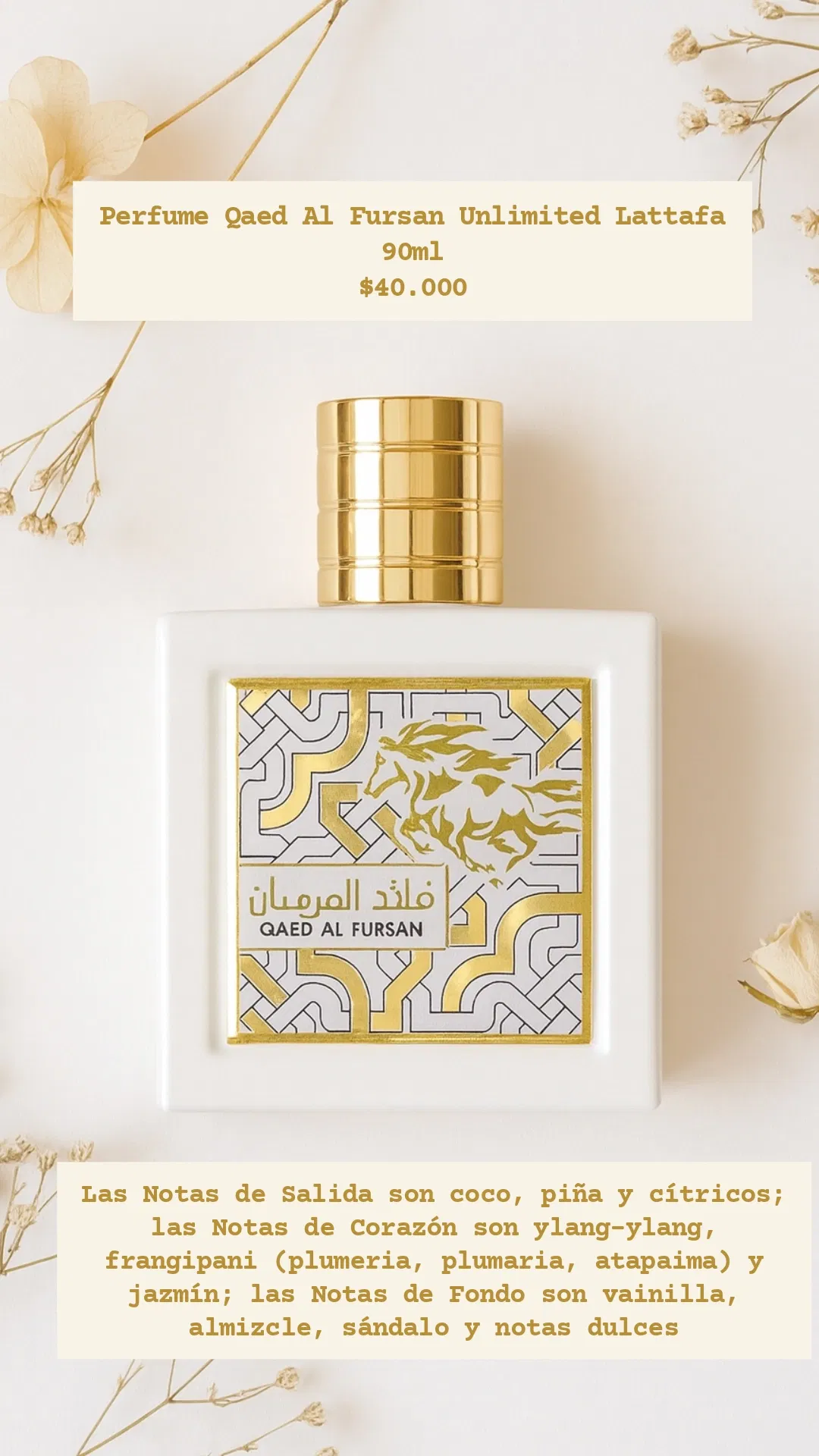 Qaed Al Fursan Unlimited de Lattafa Perfumes es una fragancia de la familia olfativa para Hombres y Mujeres. Esta fragrancia es nueva. Qaed Al Fursan Unlimited se lanzó en 2022. Las Notas de Salida son coco, cítricos y piña; las Notas de Corazón son ylang-ylang, jazmín y frangipani (plumeria, plumaria, atapaima); las Notas de Fondo son vainilla, almizcle y sándalo.