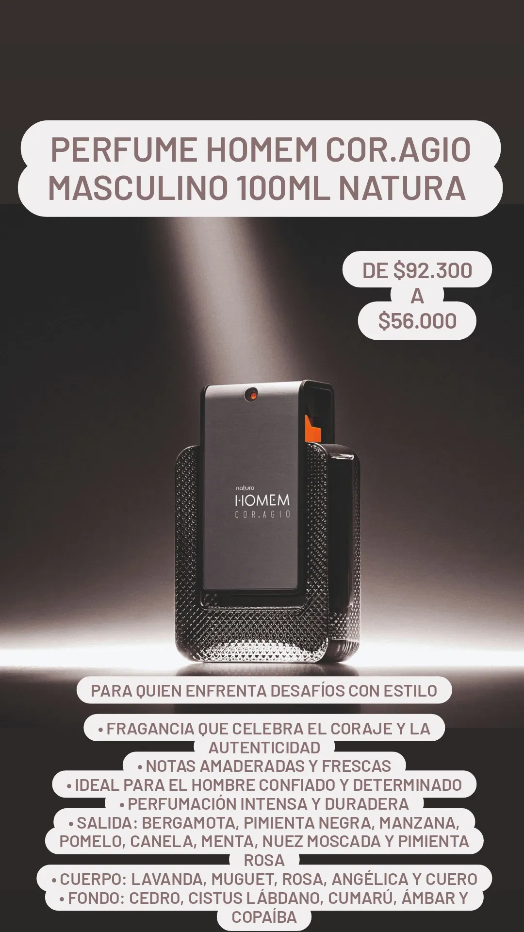 • salida: bergamota, pimienta negra, manzana, pomelo, canela, menta, nuez moscada y pimienta rosa