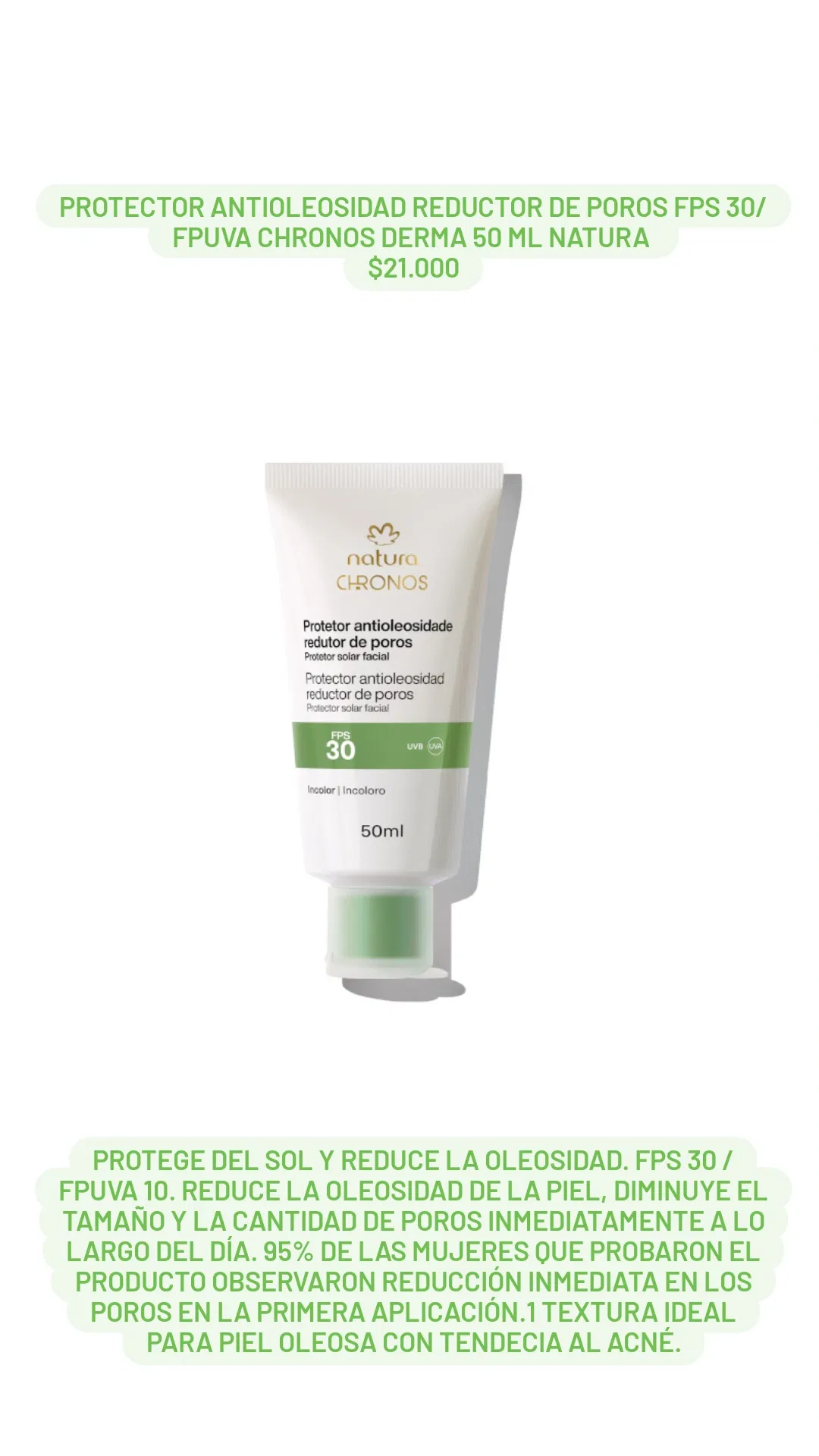 Protege del sol y reduce la oleosidad. FPS 30 / FPUVA 10. Reduce la oleosidad de la piel, diminuye el tamaño y la cantidad de poros inmediatamente a lo largo del día. 95% de las mujeres que probaron el producto observaron reducción inmediata en los poros en la primera aplicación.1 Textura ideal para piel oleosa con tendecia al acné.