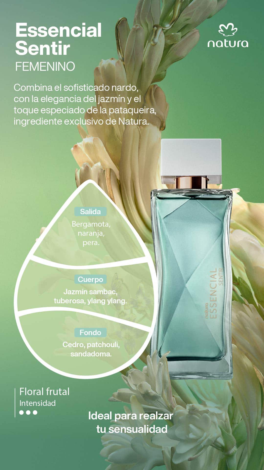 • combina la cremosidad de la tuberosa, flor blanca de una opulencia incomparable, con la sensualidad del jazmín