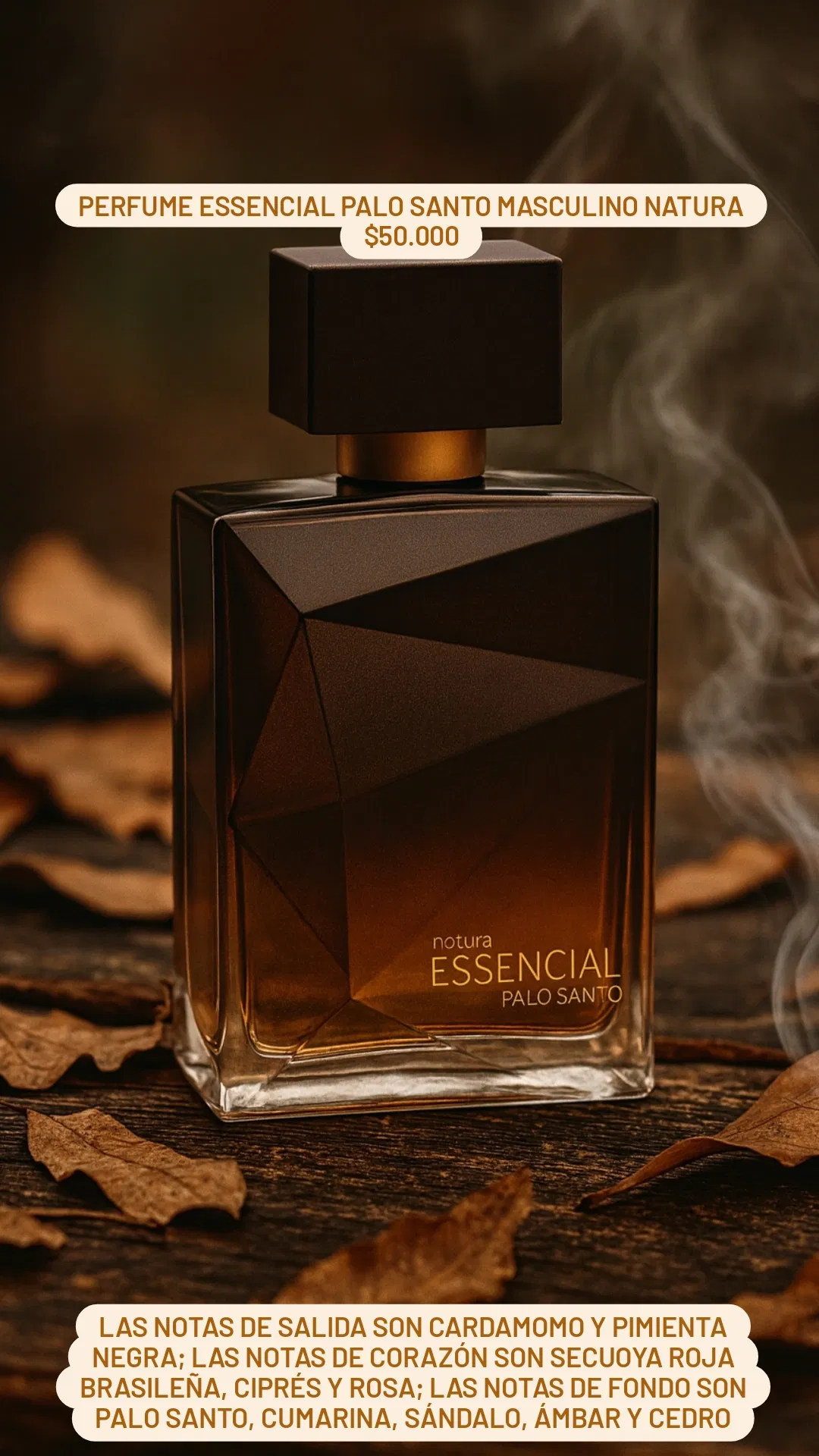 Las Notas de Salida son cardamomo y pimienta negra; las Notas de Corazón son secuoya roja brasileña, ciprés y rosa; las Notas de Fondo son palo santo, cumarina, sándalo, ámbar y cedro