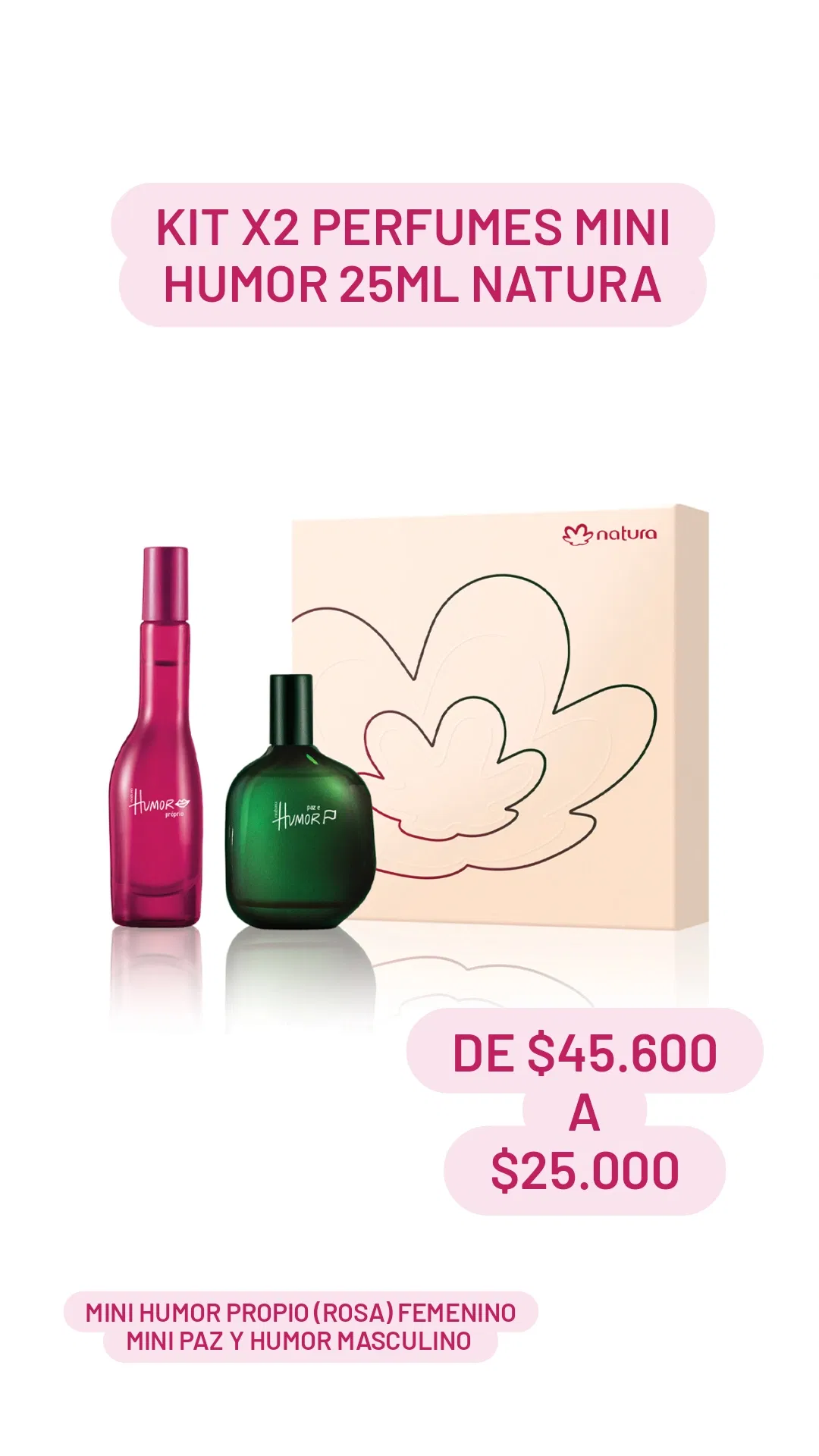 Paz e Humor masculino: Aromático cítrico. Geranio, Bergamota, lavanda Humor Próprio femenino: Floral frutal. Cereza en almíbar, Ámbar, Vainilla 2 unidades x 25 ml c/u
