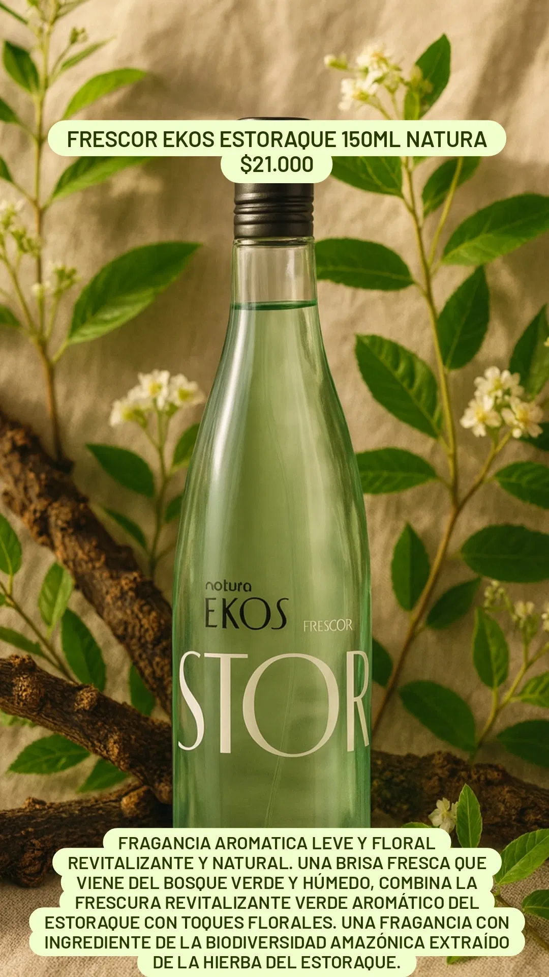 Revitalizante y natural. Una brisa fresca que viene del bosque verde y húmedo, combina la frescura revitalizante verde aromático del estoraque con toques florales. Una fragancia con ingrediente de la biodiversidad amazónica extraído de la hierba del estoraque.