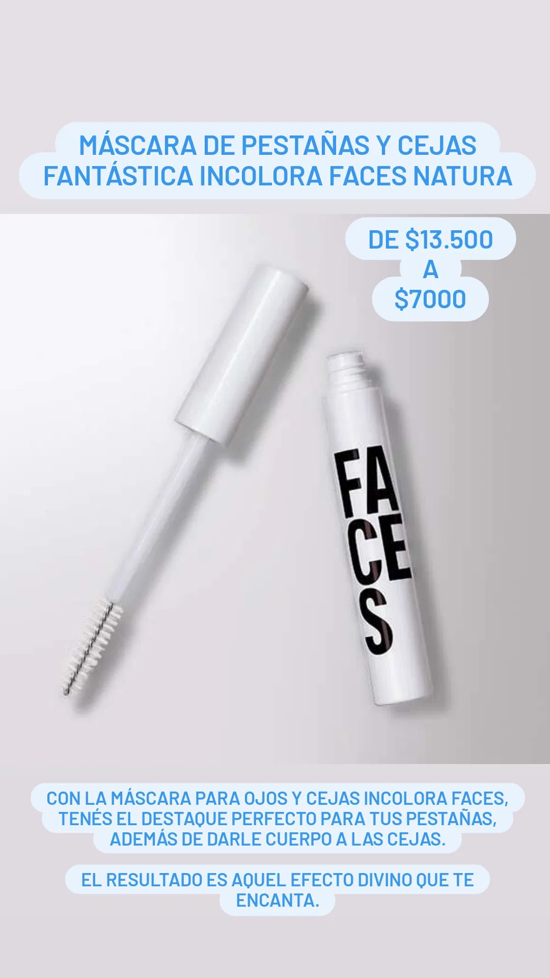 Con la Máscara para Ojos y Cejas Incolora Faces, tenés el destaque perfecto para tus pestañas, además de darle cuerpo a las cejas.