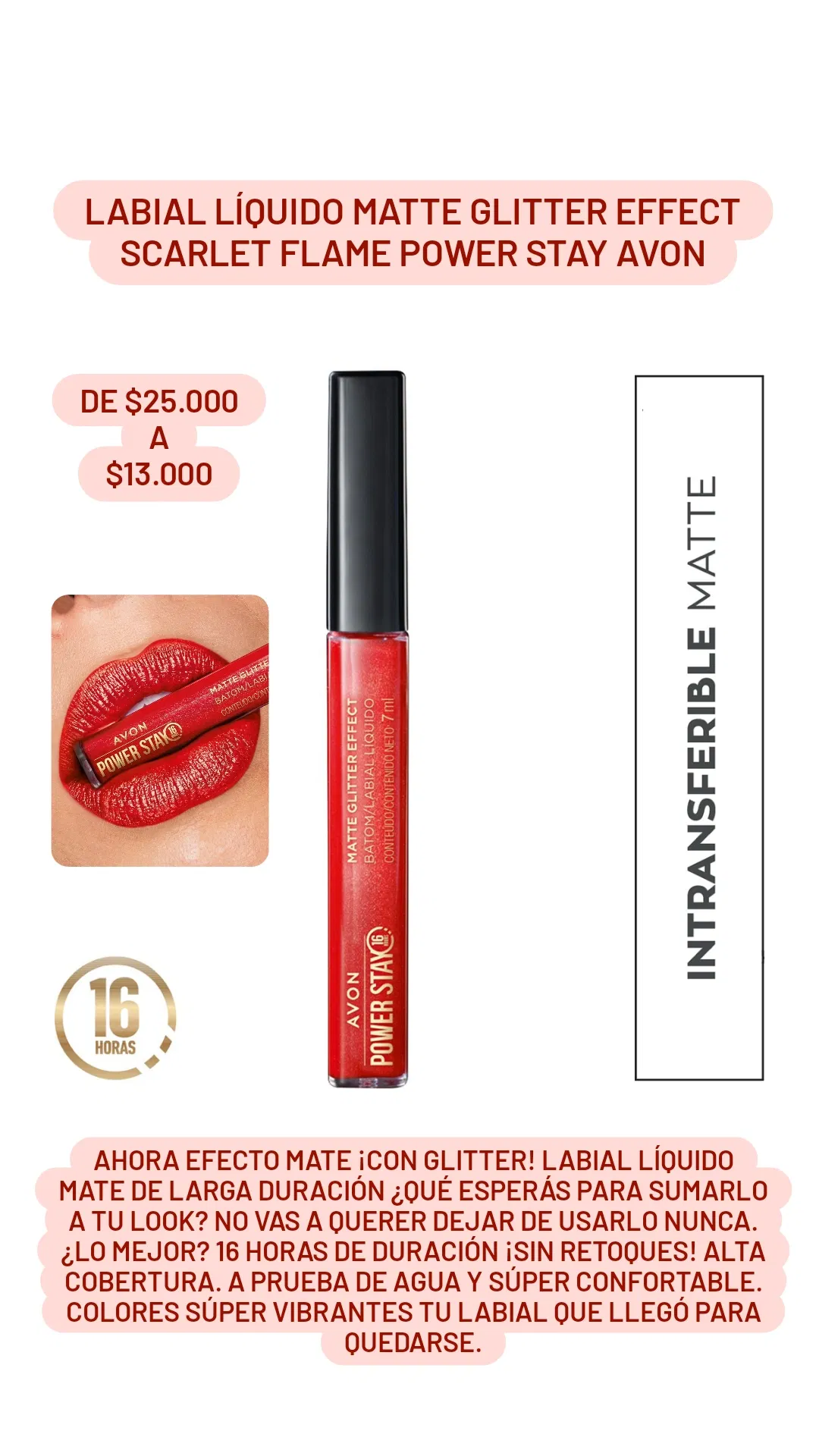 Ahora efecto mate ¡con glitter! Labial líquido mate de larga duración ¿Qué esperás para sumarlo a tu look? No vas a querer dejar de usarlo nunca. ¿Lo mejor? 16 horas de duración ¡sin retoques! Alta cobertura. A prueba de agua y súper confortable. Colores súper vibrantes Tu labial que llegó para quedarse.