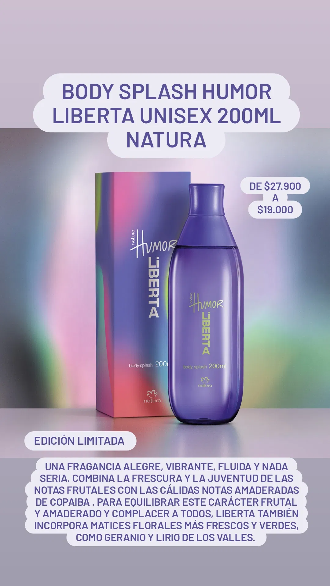 Una fragancia alegre, vibrante, fluida y nada seria. Combina la frescura y la juventud de las notas frutales con las cálidas notas amaderadas de copaiba . Para equilibrar este carácter frutal y amaderado y complacer a todos, Liberta también incorpora matices florales más frescos y verdes, como geranio y lirio de los valles.