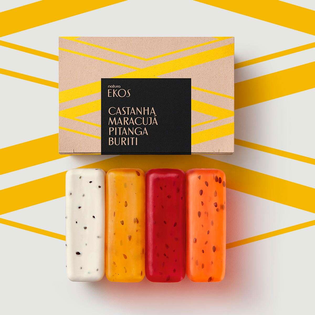 • caja con 4 unidades (1 castaña, 1 maracuyá, 1 buriti y 1 pitanga) de 100 g cada una