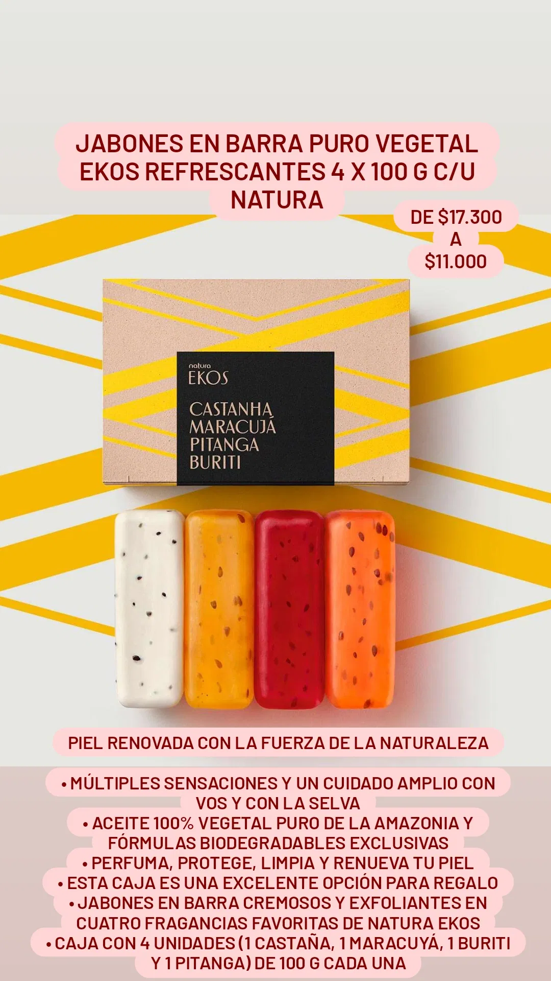 • jabones en barra cremosos y exfoliantes en cuatro fragancias favoritas de Natura Ekos