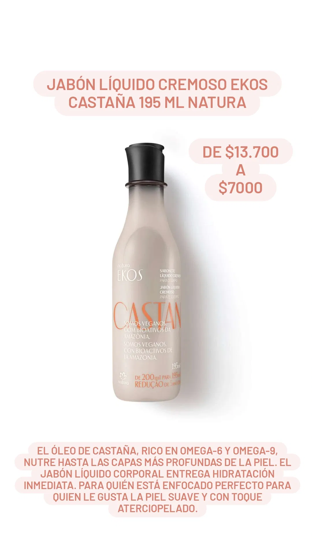 El óleo de castaña, rico en Omega-6 y Omega-9, nutre hasta las capas más profundas de la piel. El jabón líquido corporal entrega hidratación inmediata. Para quién está enfocado Perfecto para quien le gusta la piel suave y con toque aterciopelado.