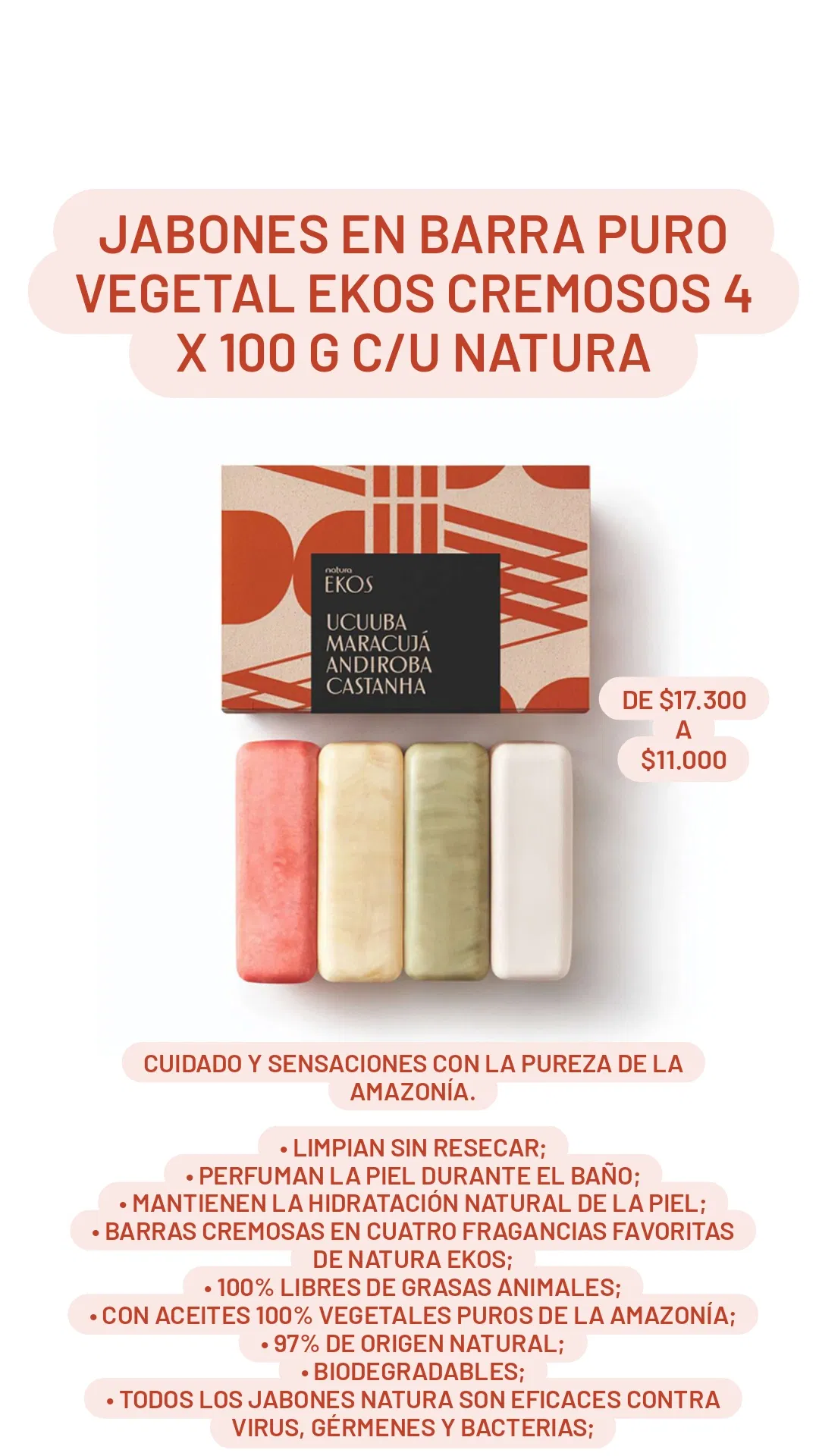 • barras cremosas en cuatro fragancias favoritas de Natura Ekos;