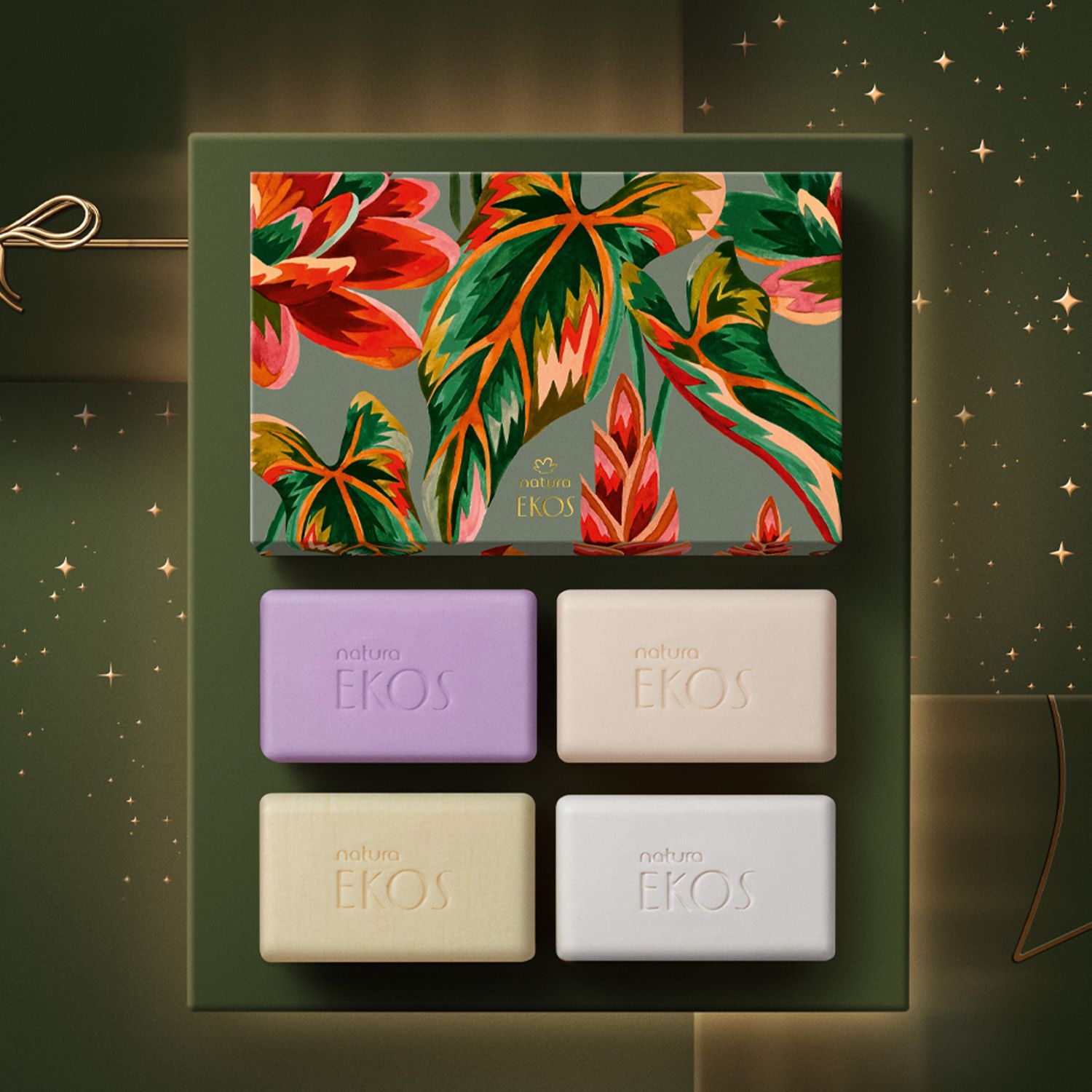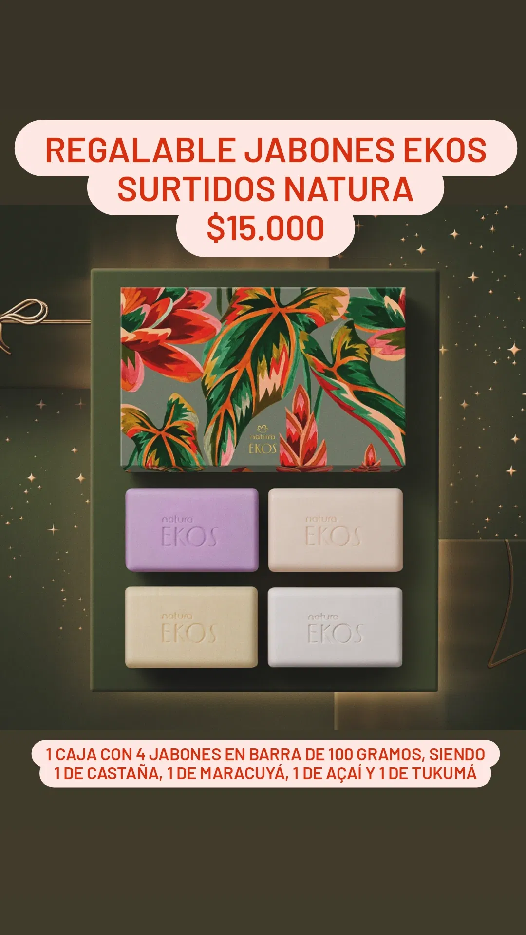 1 caja con 4 jabones en barra de 100 gramos, siendo 1 de castaña, 1 de maracuyá, 1 de açaí y 1 de tukumá.